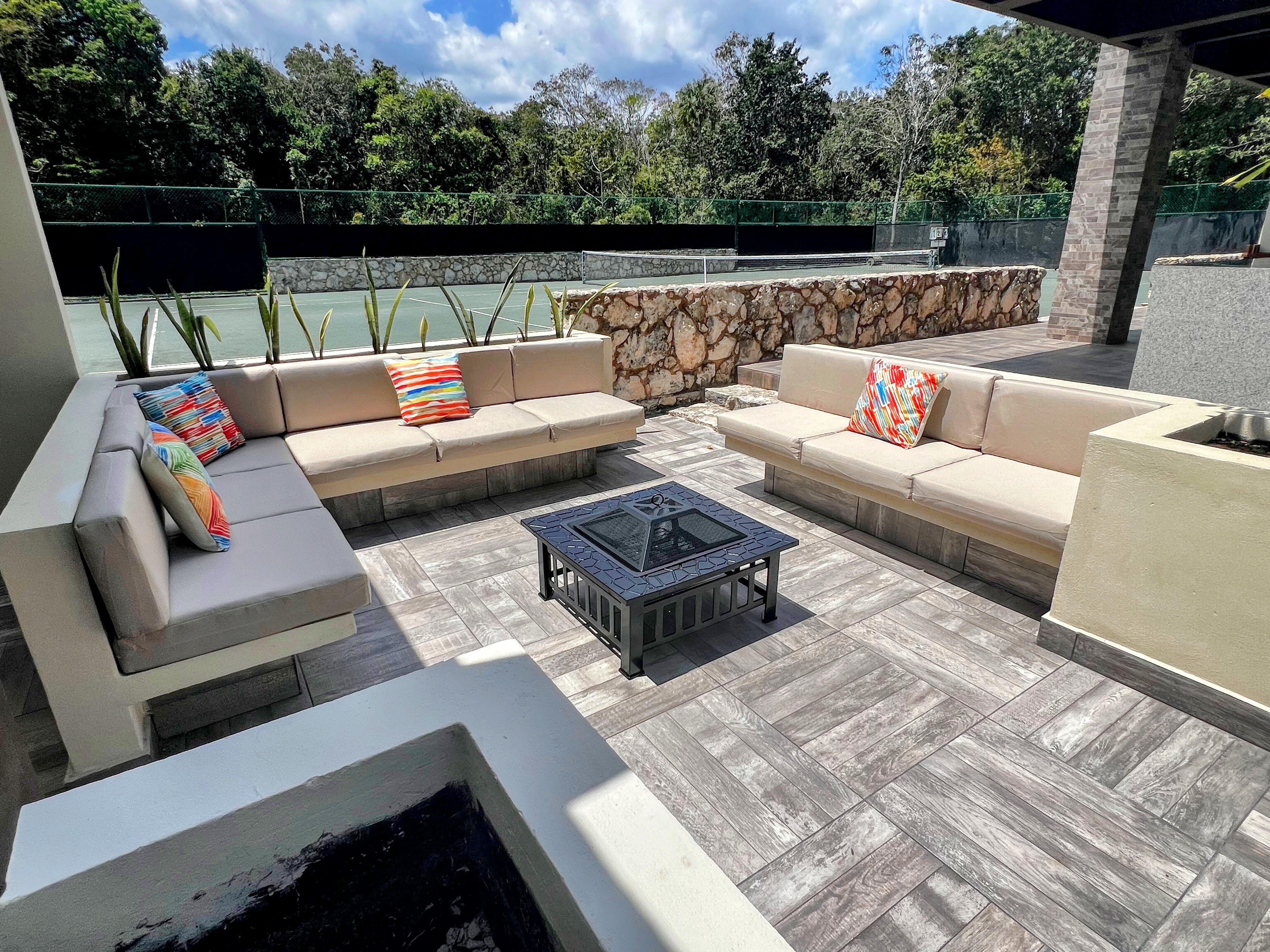 The Fire Pit & Lounge Sitting area offers a cozy space perfect for relaxation and connection. Featuring comfortable lounge sofas surrounding a central fire pit,