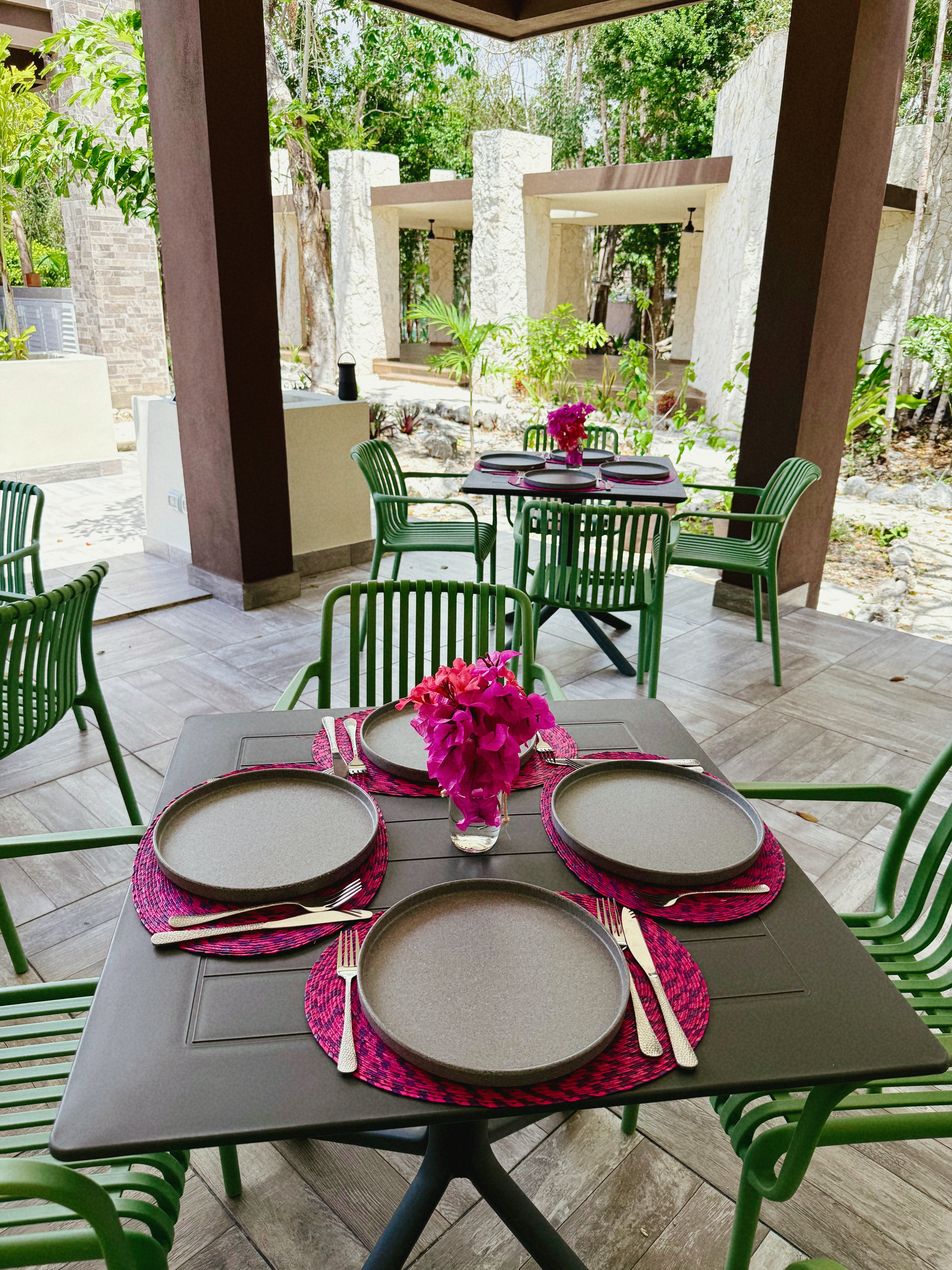 Adjacent to the Fire Pit & Lounge Sitting area, the Main Dining Area offers a charming space with four tables under a covered roof. This open-air dining spot allows you to enjoy meals in a comfortable, shaded setting while still being immersed in the tranquil ambiance. It’s the perfect place to gather, dine, and share moments with friends and family.